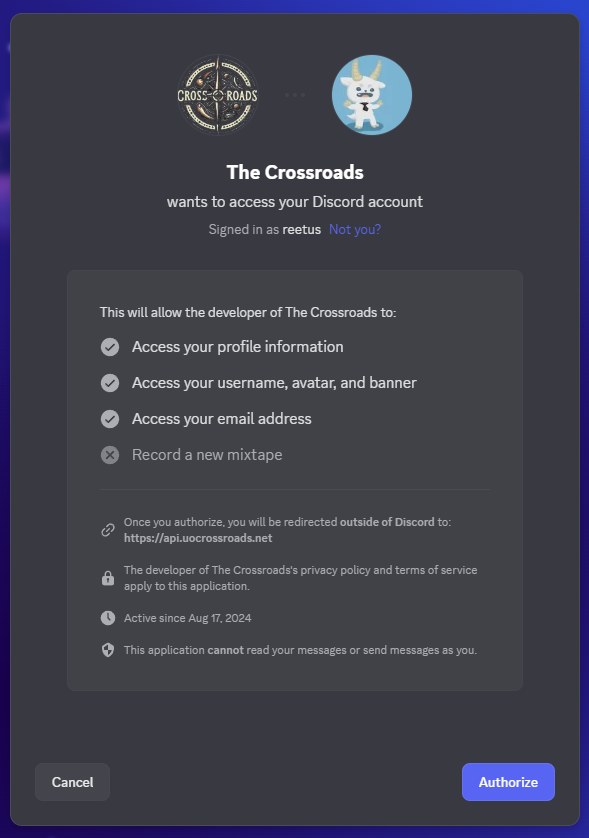 Clicking the Discord button will launch your web browser to authorize the Discord login. Click 'Authorize' to grant the launcher access.